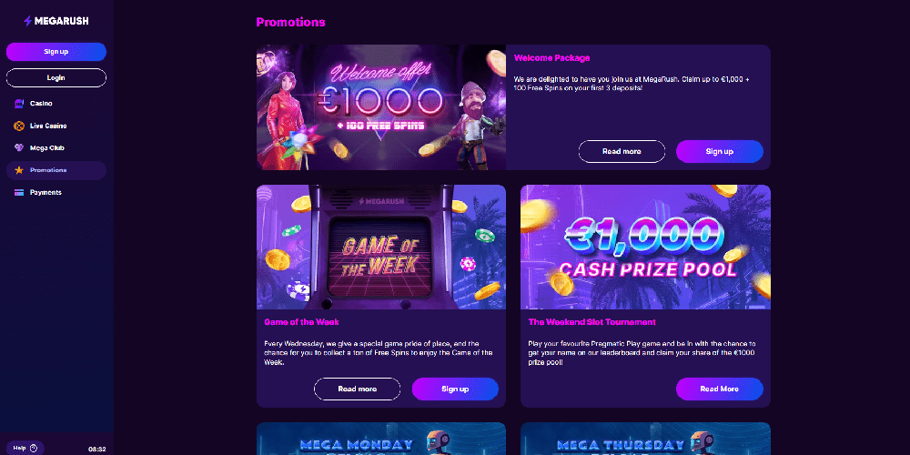 Sowohl für neue als auch für wiederkehrende Kunden bietet MegaRush Casino eine Vielzahl von Boni und Werbeaktionen, darunter ein beträchtliches Willkommenspaket mit Bonusgeld und Freispielen. Das Casino bietet auch oft Reload-Boni, Cashback-Angebote und einzigartige Werbeaktionen, die mit bestimmten Spielen oder Anlässen verbunden sind.