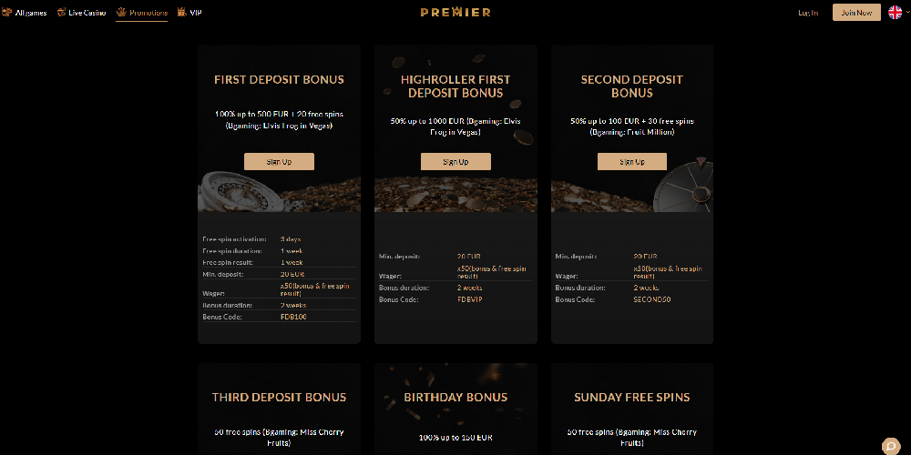 perks: Both new and returning customers at Premier Casino may take advantage of a variety of perks. A match bonus and free spins are part of the welcome bonus package available to new players. Additionally, the casino runs weekly and monthly promotions with free spins, cashback bonuses, and reload bonuses. All bonuses come with wagering requirements and other terms and conditions, which should be read before accepting the bonus, it's important to note.