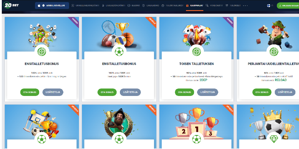 Mobiilikasino: 20Bet-kasinoa voi käyttää mobiililaitteella sekä pöytätietokoneella. Koska kasinoa on parannettu pelaamista varten mobiililaitteilla, pelaajat voivat ottaa suosikkipelinsä mukaan minne tahansa.