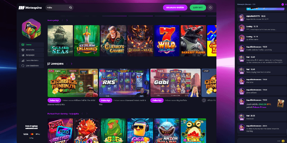Maailman parhaat peliyhtiöt ovat lisänneet nimikkeensä Metaspins Casinon valtavaan pelikirjastoon. Kasino tarjoaa monipuolisen valikoiman peliautomaatteja, mukaan lukien joitain tunnetuimmista peleistä, kuten Gonzo's Quest, Starburst ja Book of Dead, sekä progressiivisia jättipottipelejä, kuten Mega Moolah ja Mega Fortune. Lisäksi pelaajilla on mahdollisuus osallistua erilaisiin pöytäpeleihin, mukaan lukien blackjack, ruletti, baccarat ja muut. Evolution Gamingin tarjoamat live-jakajapelit ovat saatavilla myös Metaspins Casinolla pelaajille, jotka etsivät mukaansatempaavampaa pelikokemusta.